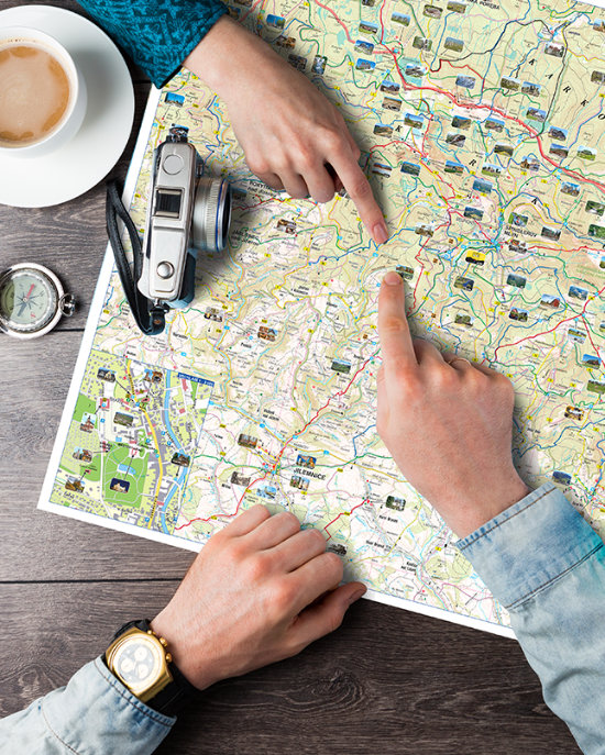 Tištěné turistické mapy, které jsou oproti běžným mapám doplněny o náhledy vydaných vizitek a popisky míst.